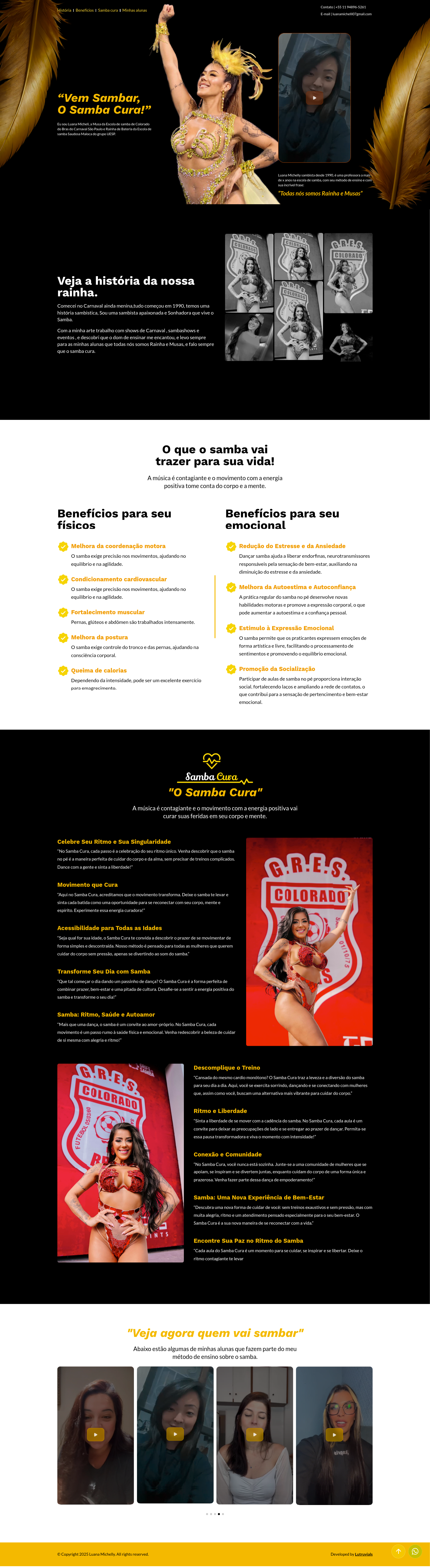 Vem sambar, Uma Landing Page, desenvolvida pela Lutruvials, para elevar a batida, e mostrar com carinho a nossa cultura. A página foi traduzida para Português, Inglês e Espanhol. Possui recursos como link direto para o Whatsapp, e também videos de testemunhas da nossa querida professora Luana.